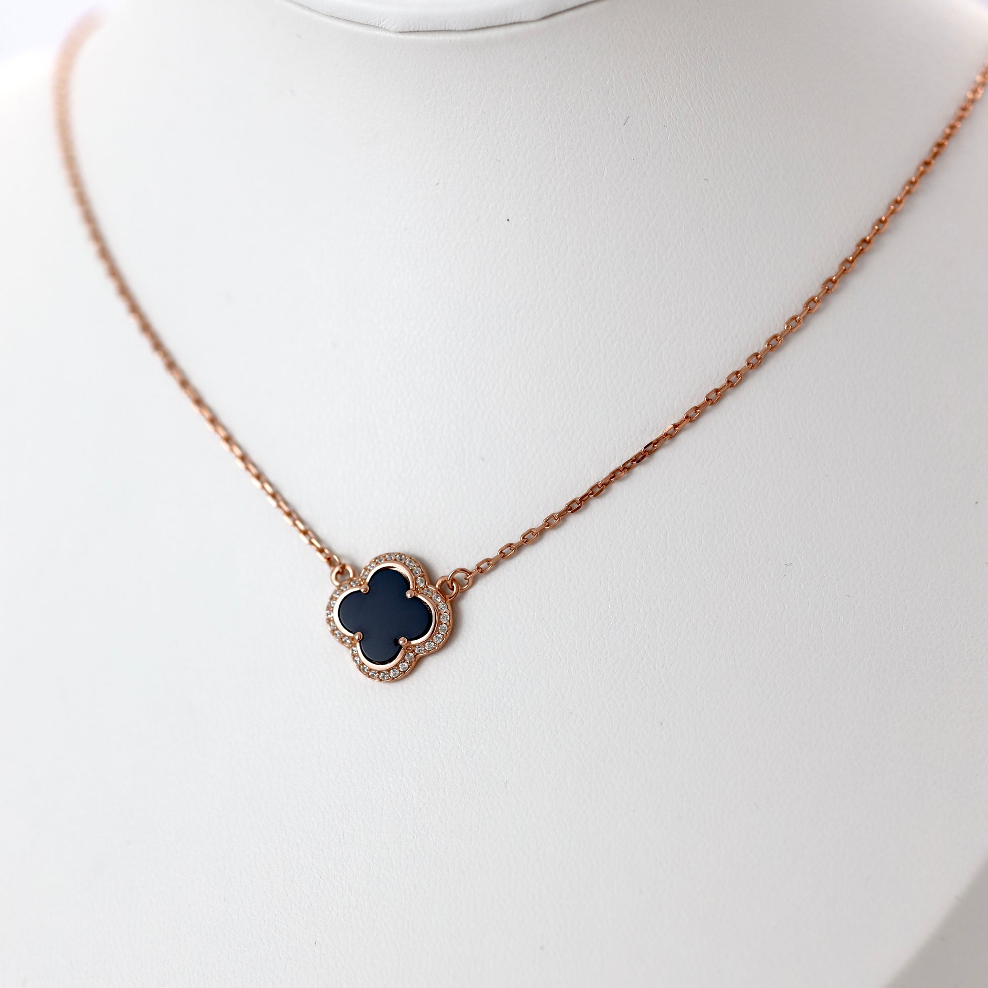 Вишукане срібне коліє з елегантною вставкою оніксу. Прикраса вкрита позолотою 585 проби, що додає теплих відтінків та робить виріб ще більш розкішним. Сяйво фіанітів гармонійно підкреслює глибину чорного каменю, створюючи стильний контраст. Це коліє стане витонченим акцентом у щоденному чи святковому образі та чудовим подарунком.