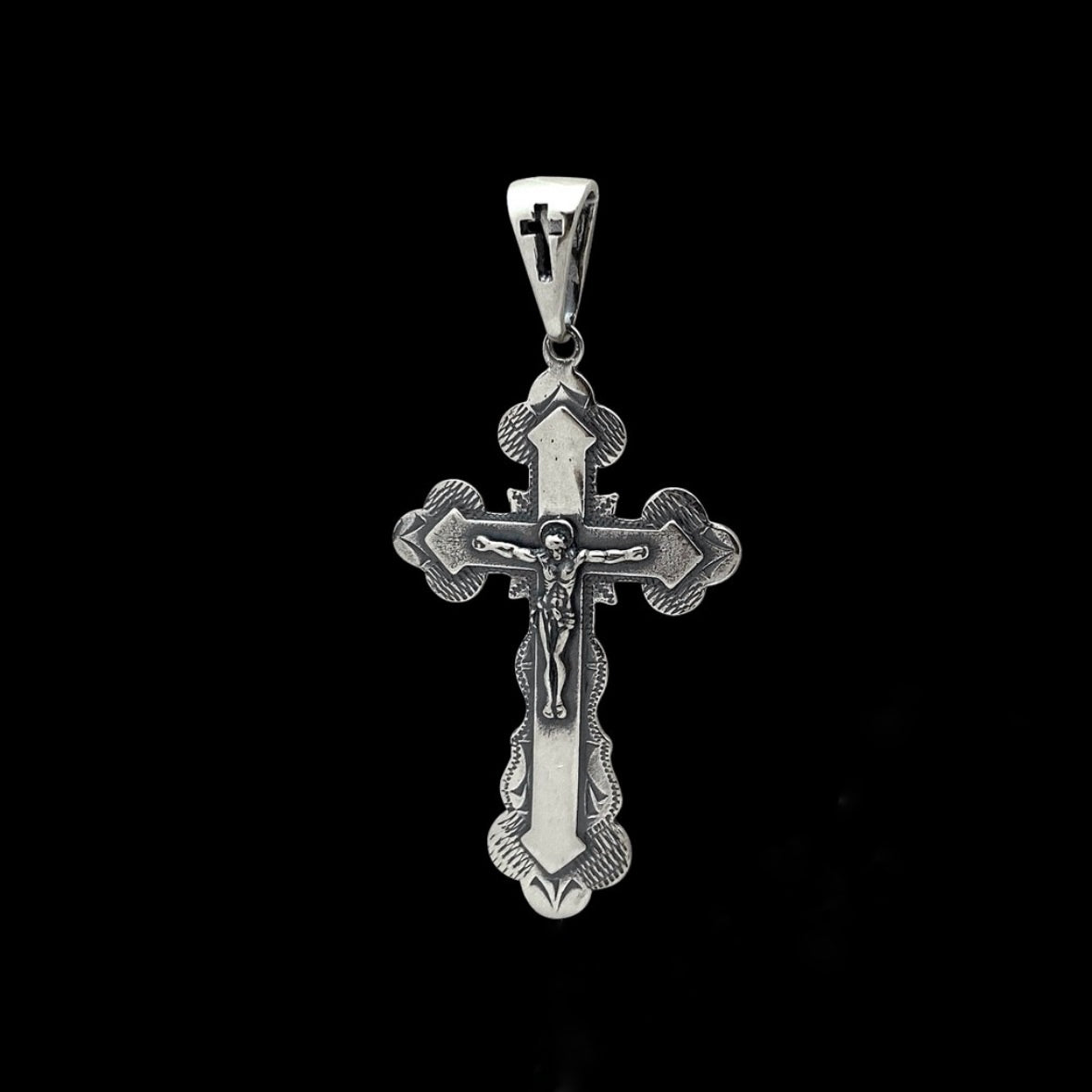 Срібний хрестик із виразним рельєфом та оксидованим покриттям, яке підкреслює деталі та надає виробу глибини й характеру. Класичний, стриманий дизайн робить цей хрестик універсальним — для щоденного носіння або як символічний подарунок.
