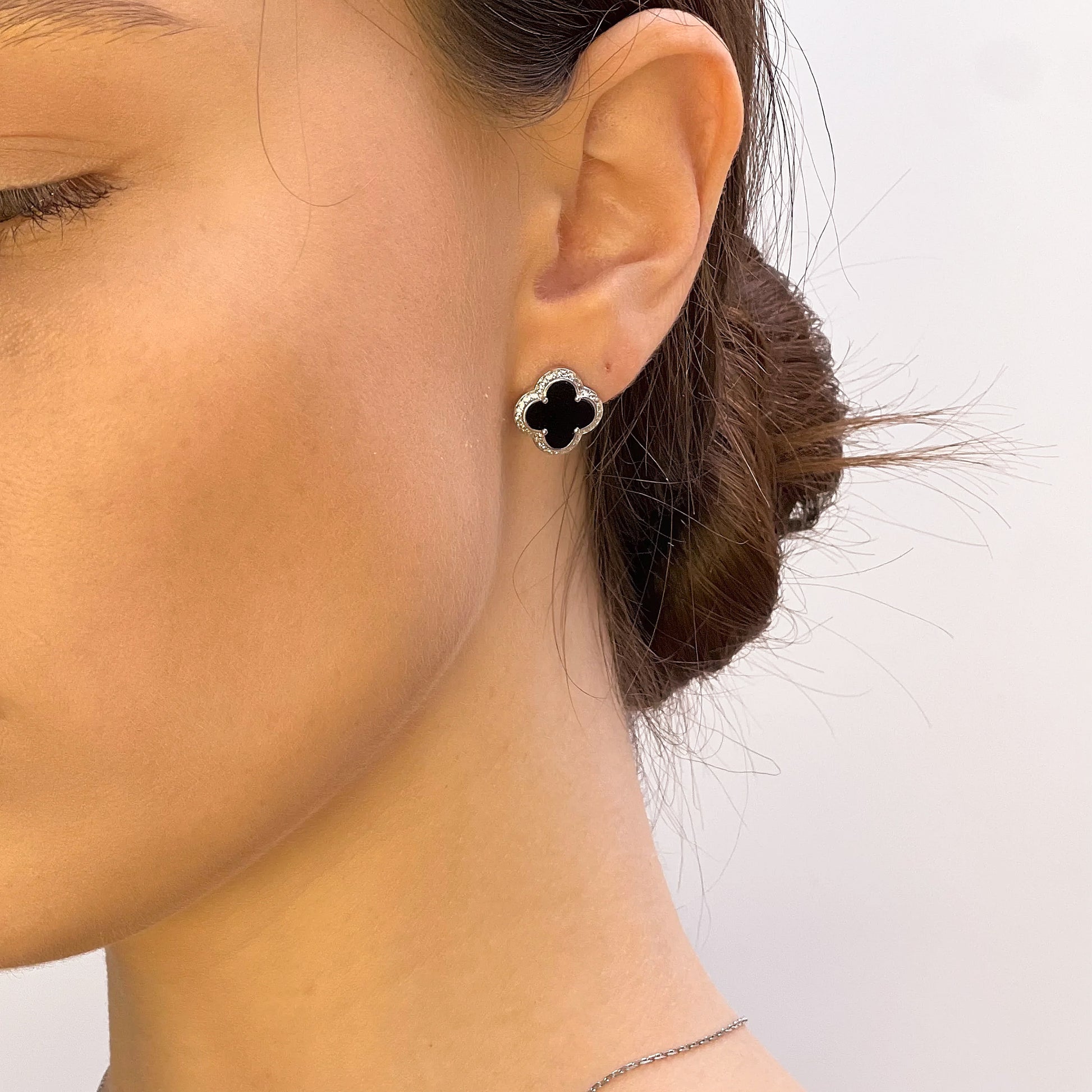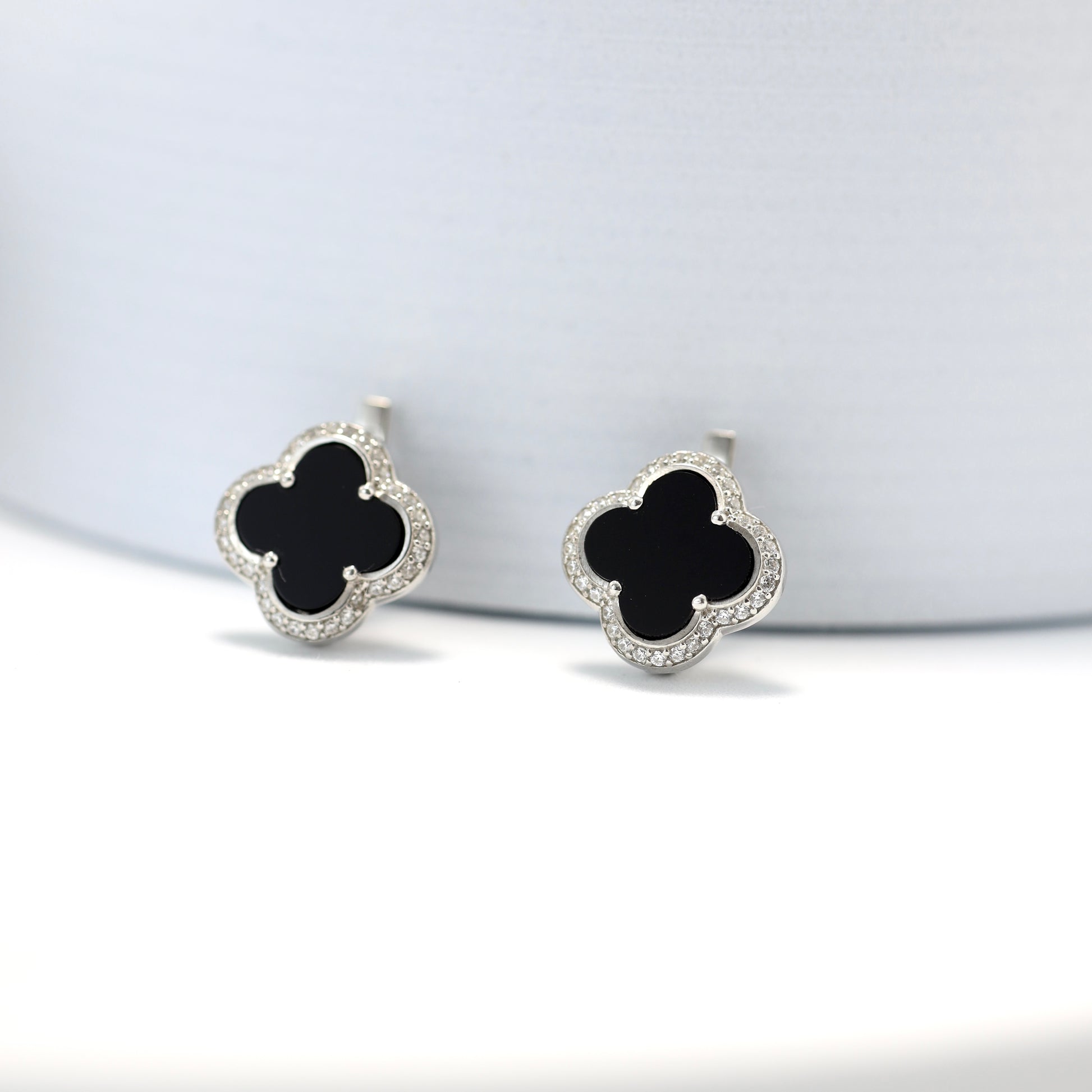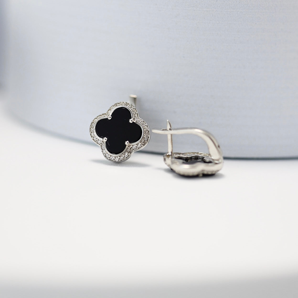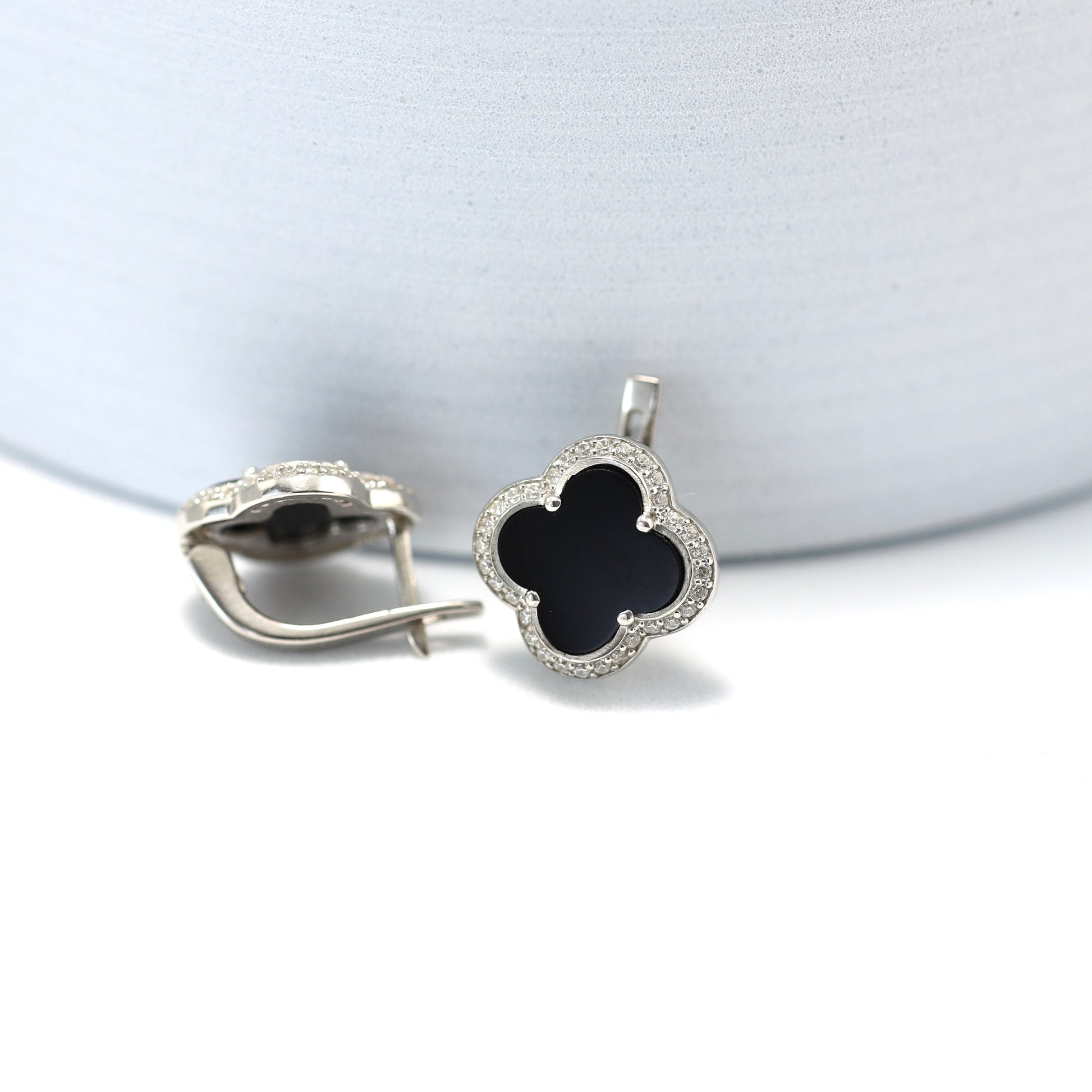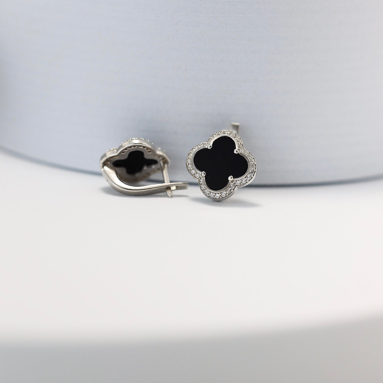 Срібні стильні сережки з чорним оніксом та дрібними фіанітими.