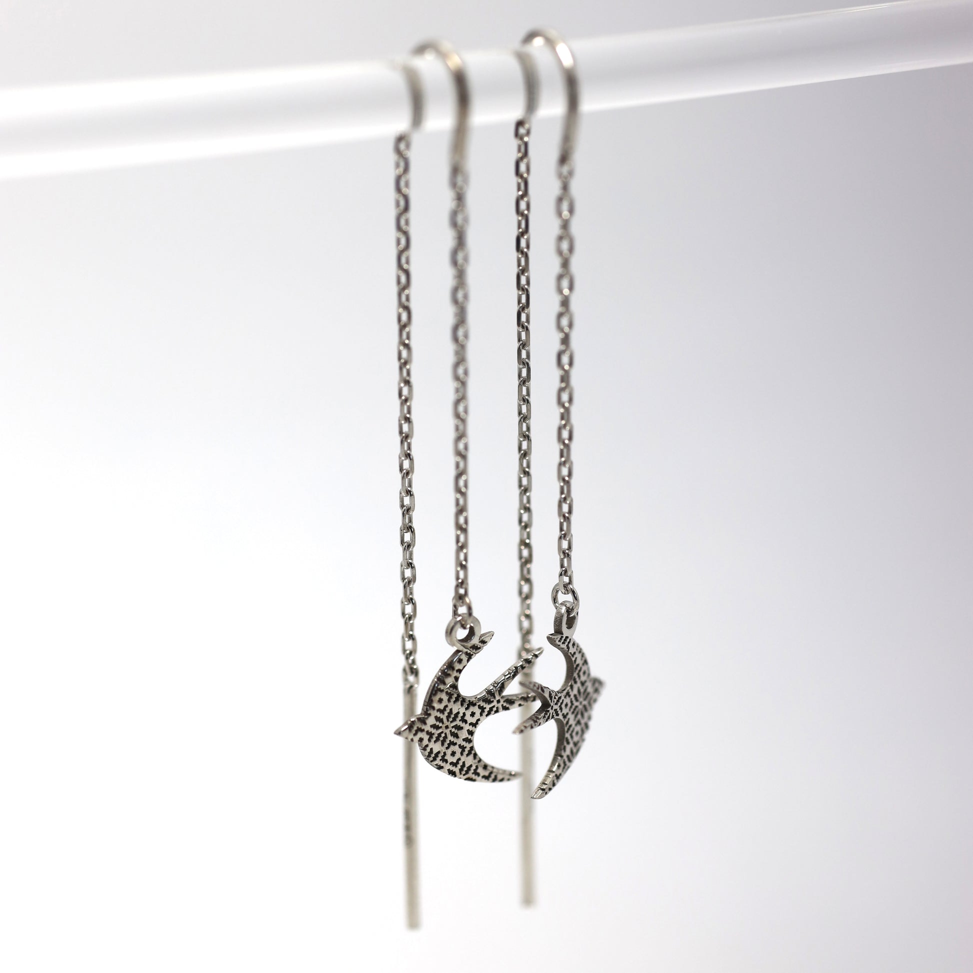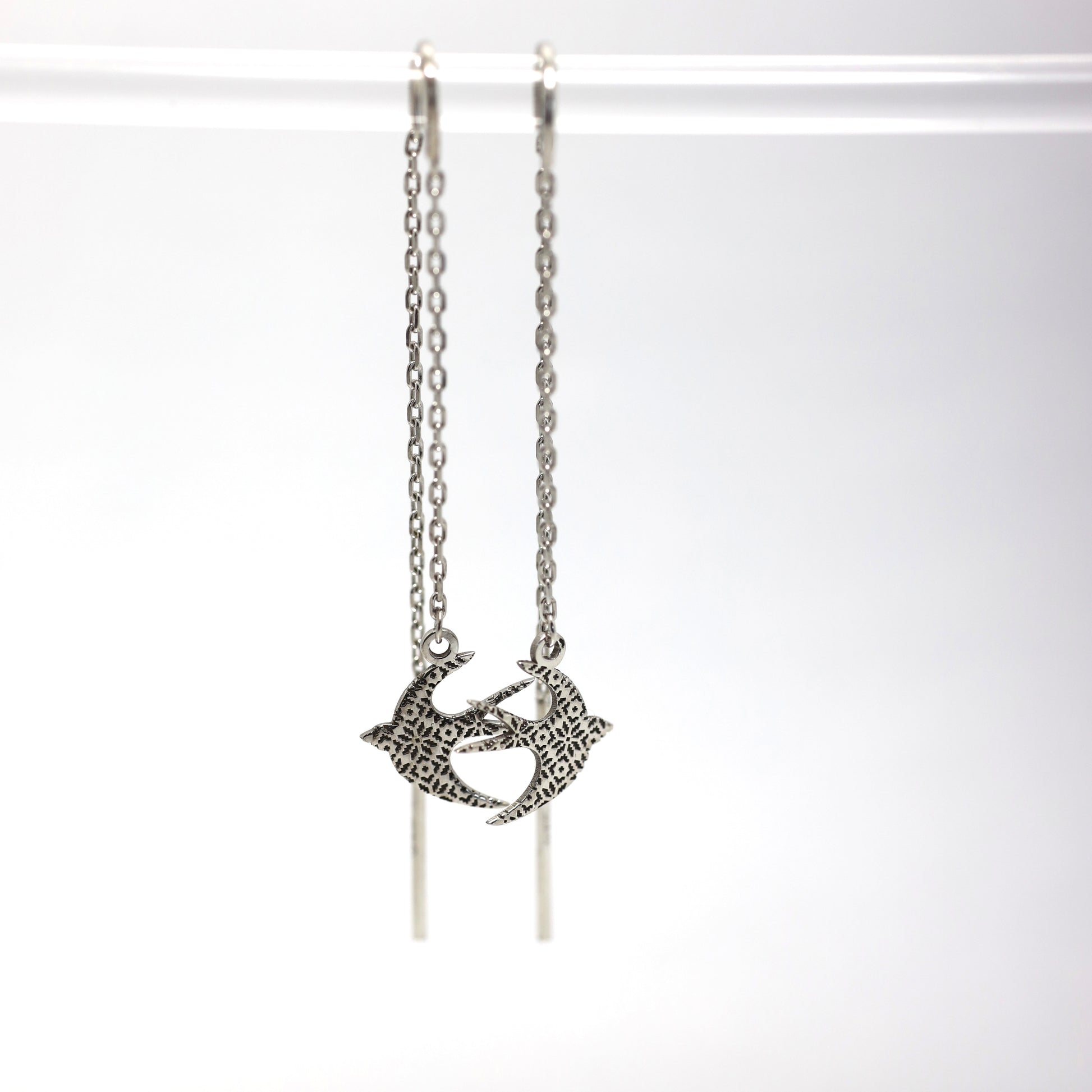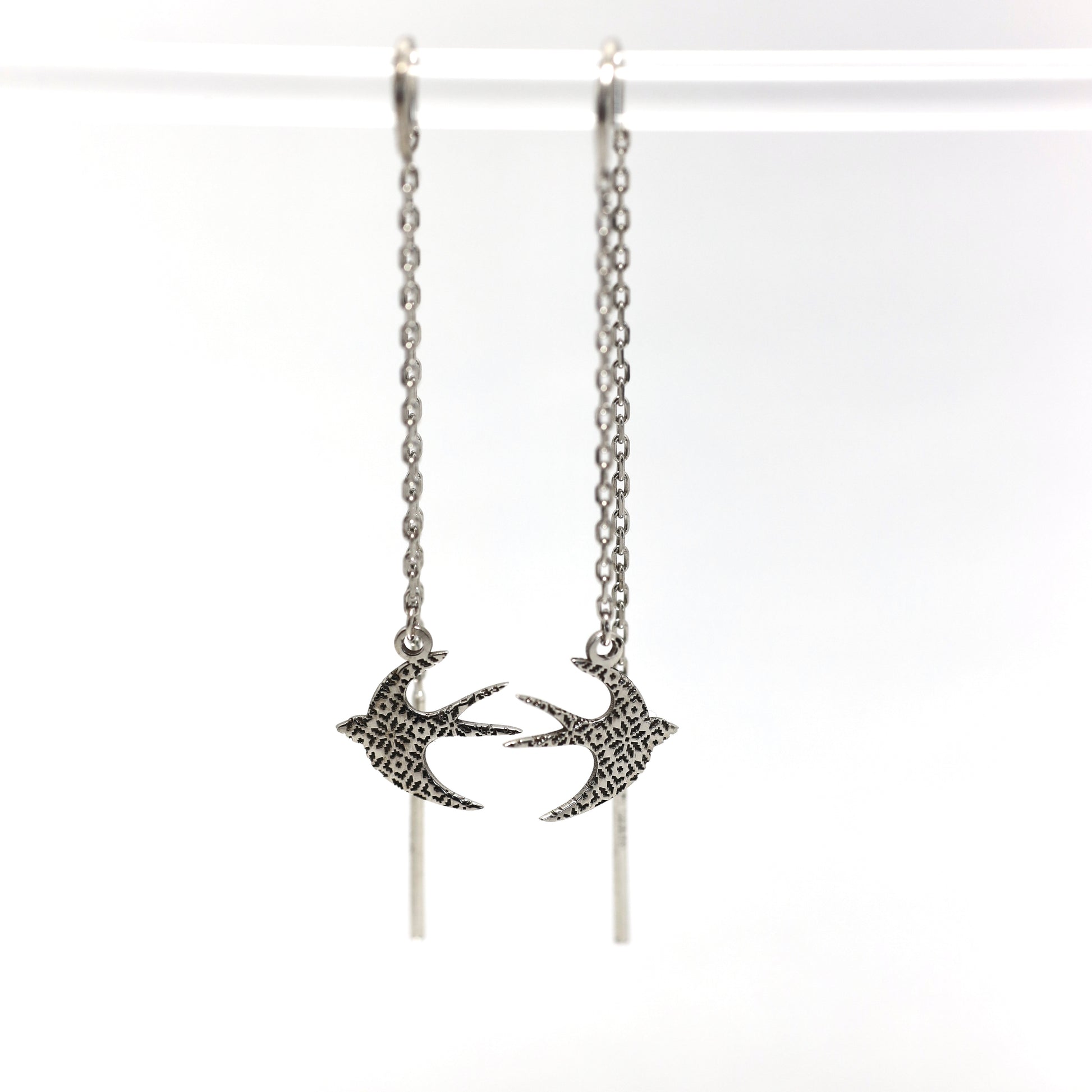 Стильні срібні подовжені сережки Ластівки,оздоблені орнаментом вишивки.