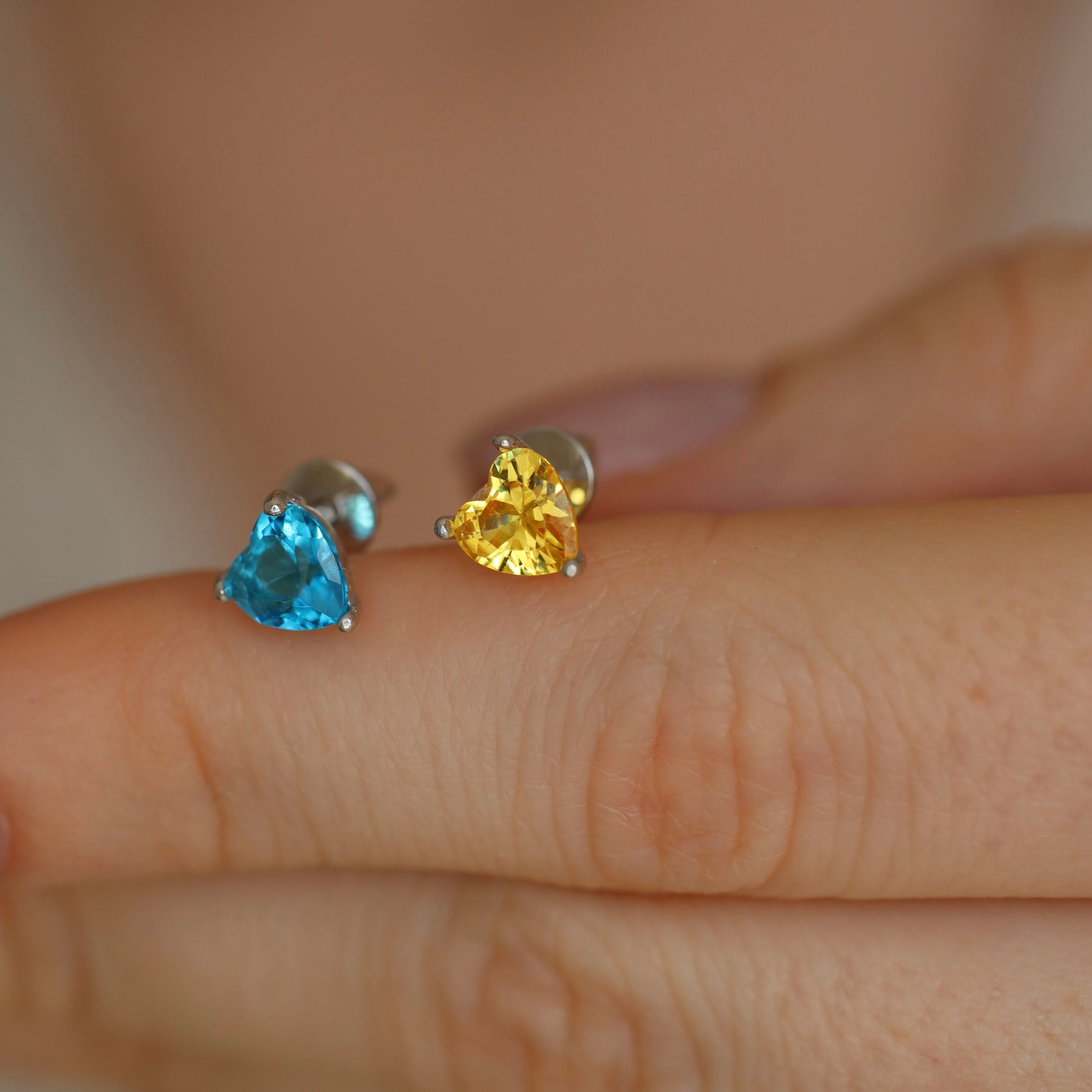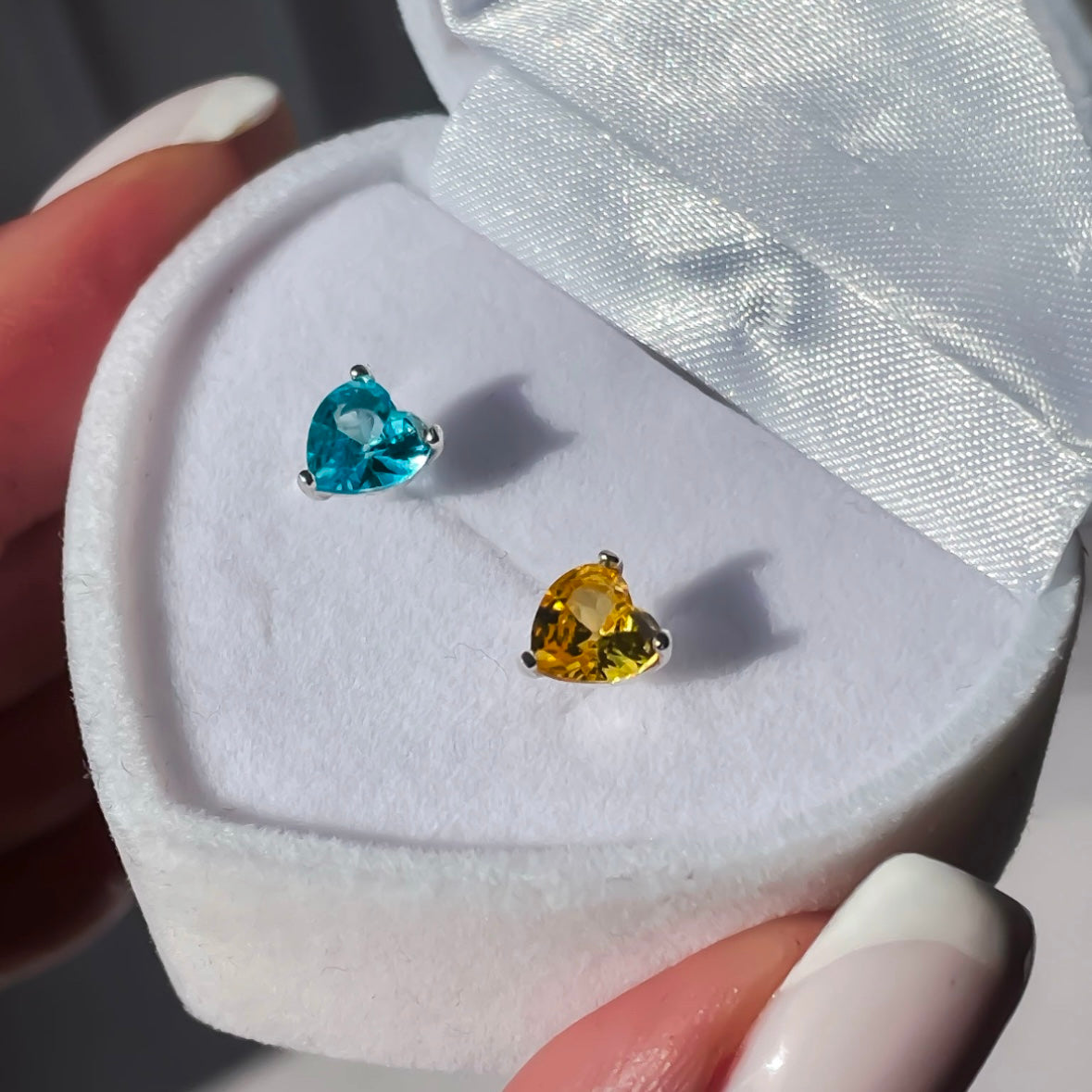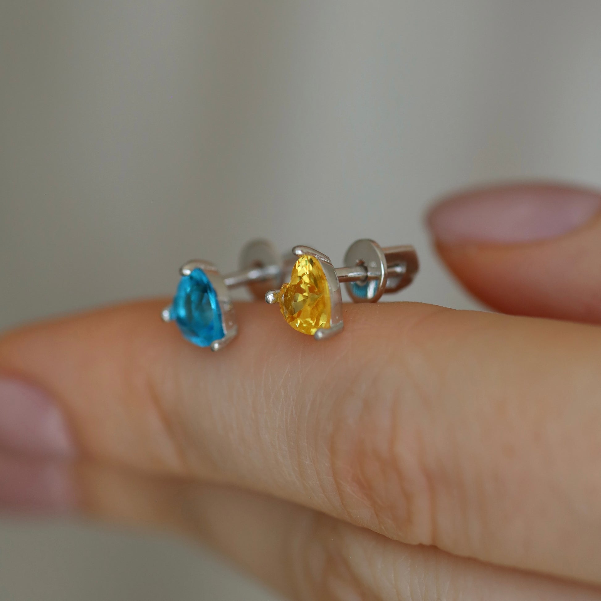 Срібні пусети з синьо-жовтими фіанітами в формі сердечок.