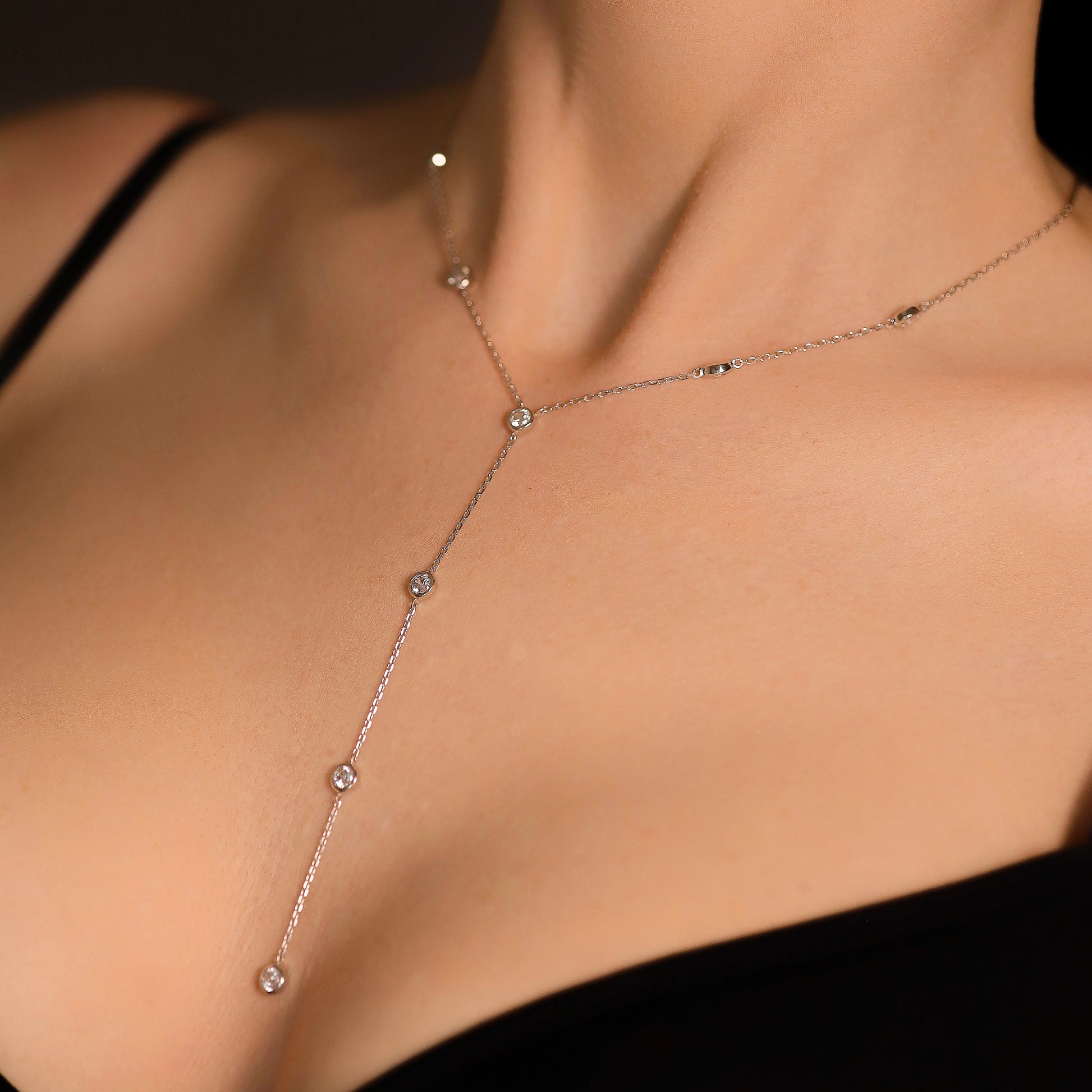 Срібне подовжене кольє з фіанітами та регульованою довжиною.